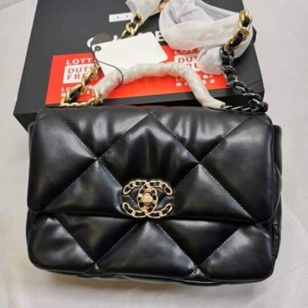The Chanel 19 Flap Bag in black with gold and silver-tone accents is the ultimate symbol of timeless elegance and modern edge. Its bold quilting and gleaming chain details exude an aura of prestige, affirming your style with effortless sophistication.