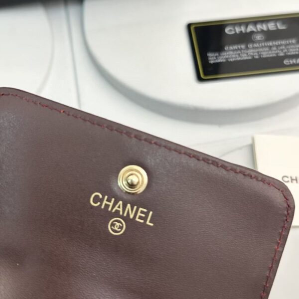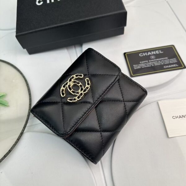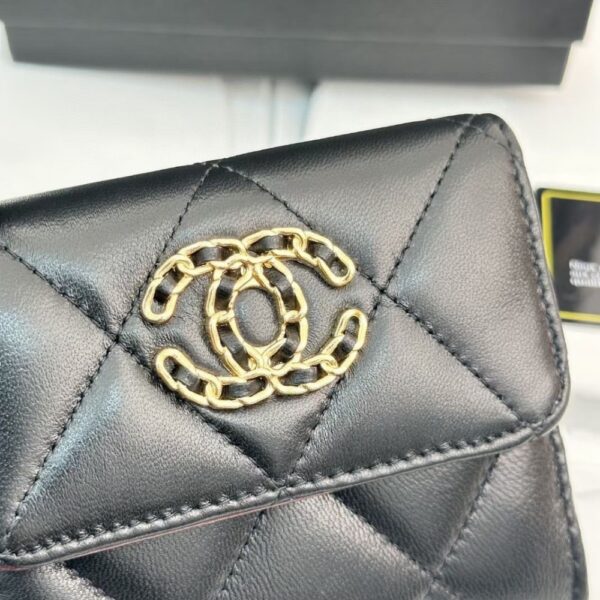 The Chanel 19 Flap Card Holder in black captures the essence of Parisian chic in a compact, refined design. With its signature quilting and bold emblem, it exudes timeless elegance, making every detail a statement of sophistication and prestige.