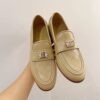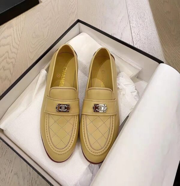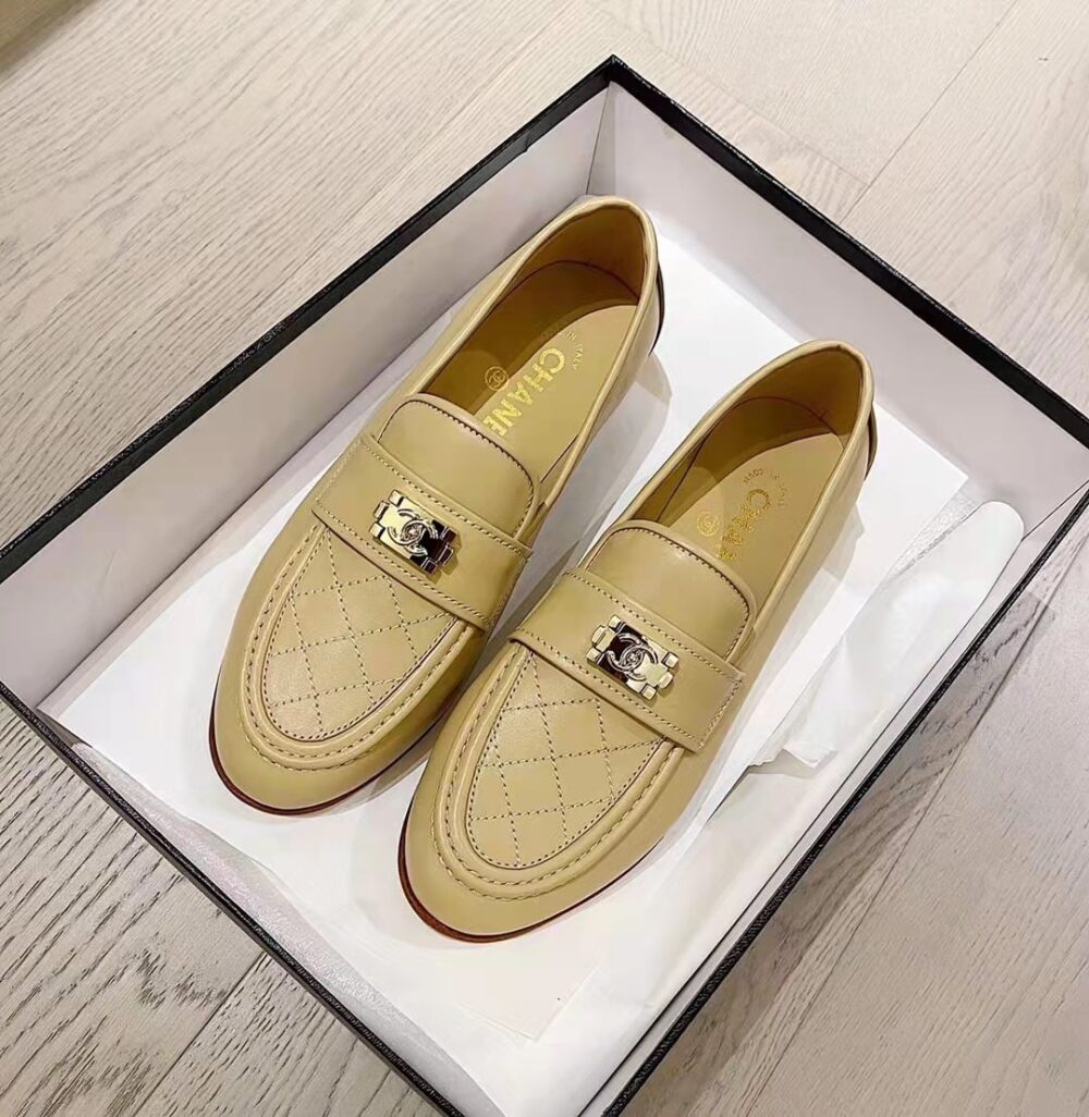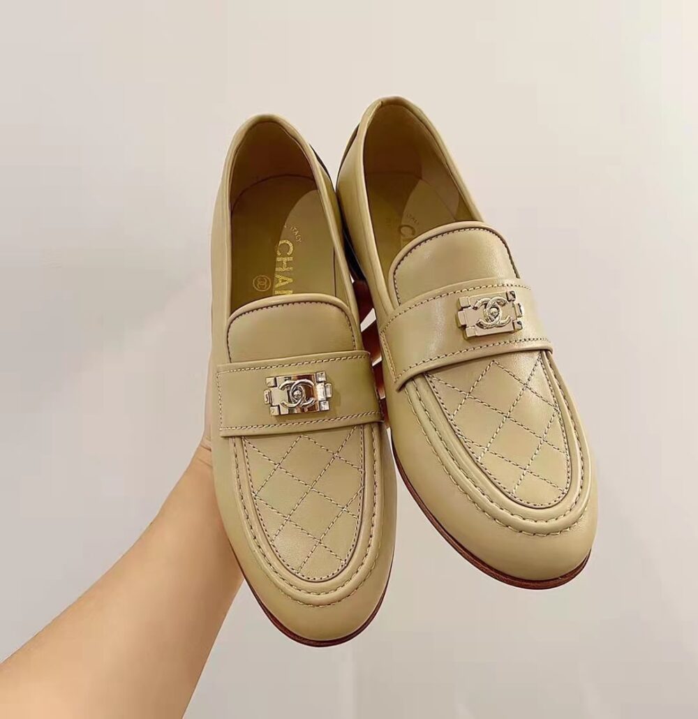 The Chanel 20B Quilted Boy Lego Metal Logo Gold Mule Slip-On Flat Loafers in Beige exude timeless elegance with a modern edge, defined by their quilted detailing and signature Boy Lego logo accent. A perfect blend of sophistication and comfort, they embody effortless prestige and refined style for every step.