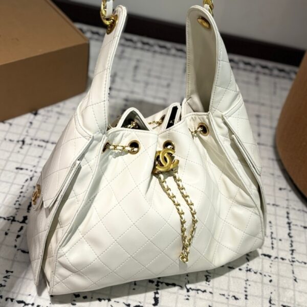 The Chanel 25 Medium Handbag in white with gold-tone accents radiates refined elegance, blending timeless quilting with striking chain details. A true icon of sophistication, it captures the essence of prestige and elevates every look with effortless luxury.