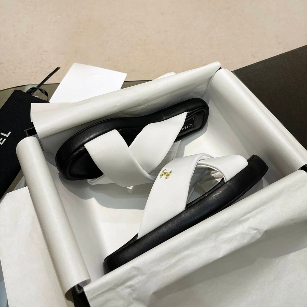 Chanel CC Logo Criss Cross Slides White