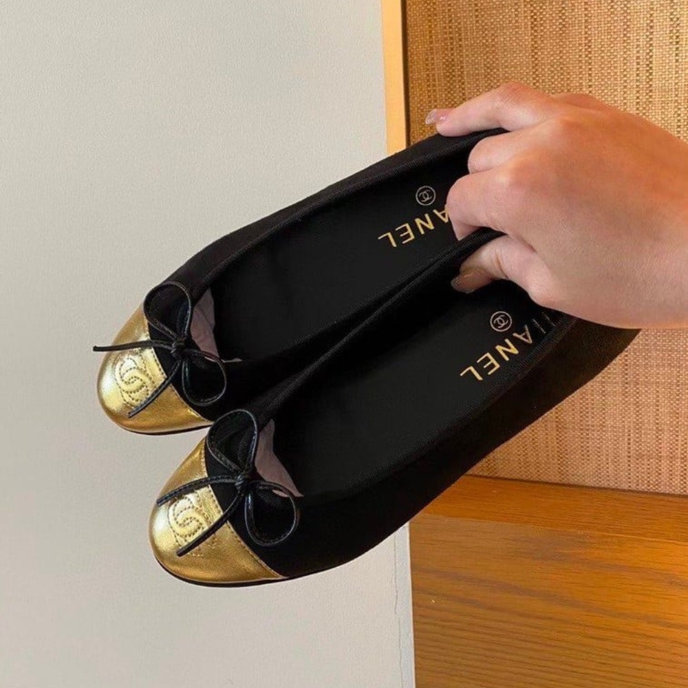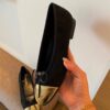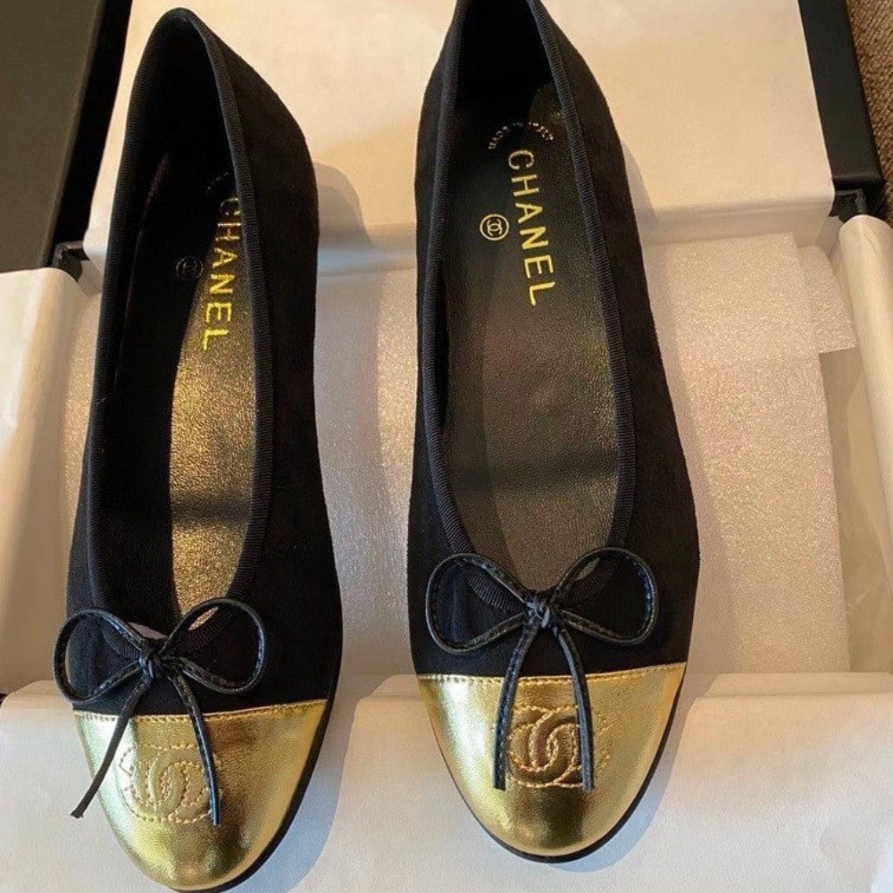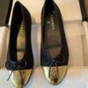 The Chanel Cap Toe Ballet Flats in black and gold exude timeless elegance with a touch of radiant allure. With their refined silhouette and iconic detailing, they embody effortless sophistication, elevating every step into a statement of prestige and style.