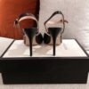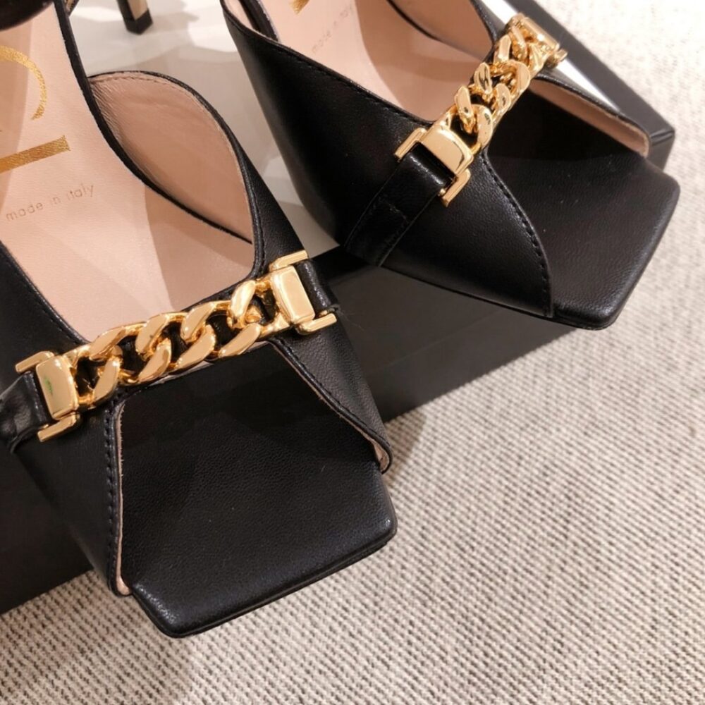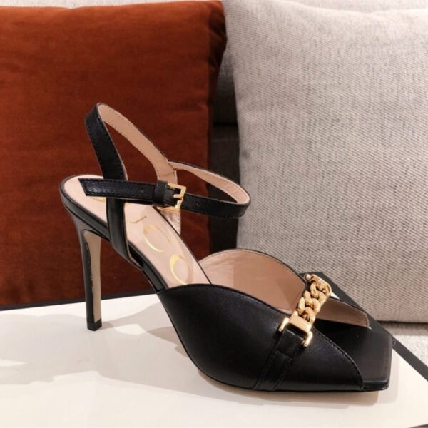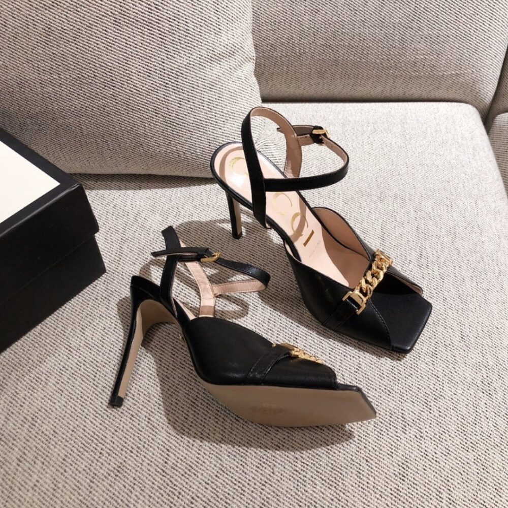 The Gucci Ankle Buckle Strap Sylvie Chain Sandals in black embody timeless sophistication with their sleek silhouette and striking golden chain detail. Designed to elevate every step, they radiate confidence, elegance, and the unmistakable prestige of iconic Italian luxury.