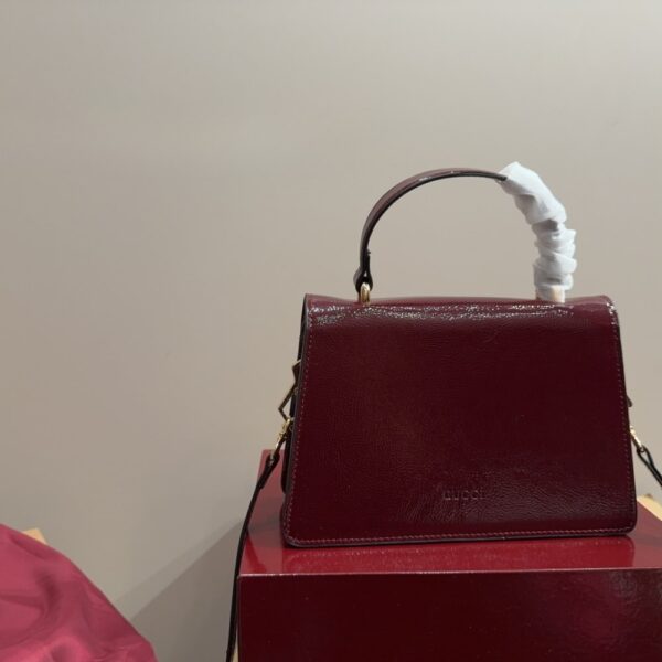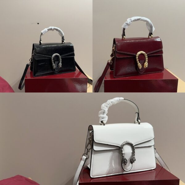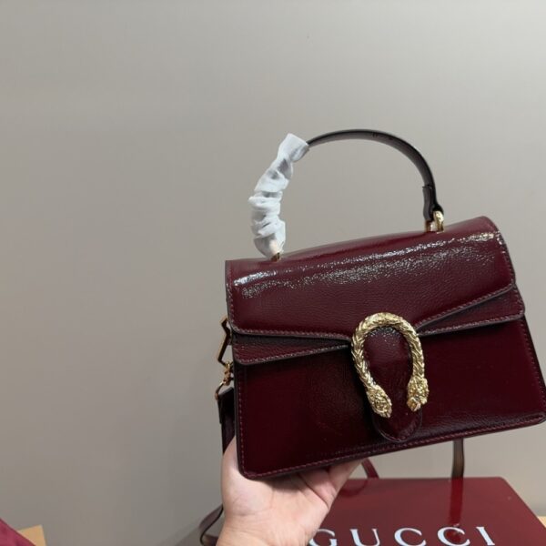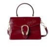 The Gucci Dionysus Top Handle Bag in deep red captivates with its bold silhouette and luminous finish, crowned by the legendary gold tiger-head closure. A symbol of strength and allure, it radiates prestige and transforms every ensemble into a statement of timeless elegance.