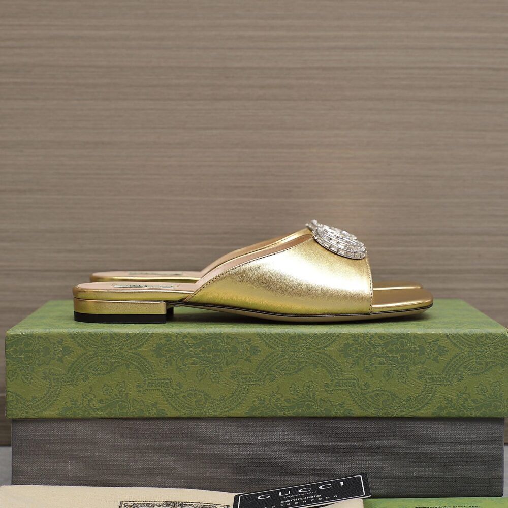 The Gucci GG Crystal Slippers in gold radiate effortless glamour, combining sleek lines with dazzling embellishment that captures the eye at every step. A symbol of prestige and refinement, they bring iconic sophistication and modern allure to elevate both casual and evening looks.