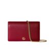 This GG Marmont wallet on chain pairs Gucci Rosso Ancora red and pink leather. The structured silhouette is adorned with the signature Double G hardware. The accessory features a detachable chain strap for effortless transition from day to night. Compact yet functional, the interior offers organized space for cards, essentials.