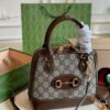 Crafted from durable beige canvas with the GG monogram, it’s trimmed with smooth brown leather and adorned with a gold-tone bit buckle, a design first used in the 1950s. This spring/summer accessory from the brand founded by Guccio Gucci can accommodate a phone, wallet, and keys.