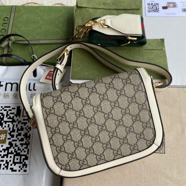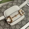 This is a Gucci 1955 Horsebit shoulder bag in GG Supreme canvas with white leather trim. It features the iconic horsebit detail in gold-tone hardware on the front flap. The structured design and adjustable shoulder strap make it a versatile everyday luxury piece.