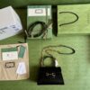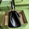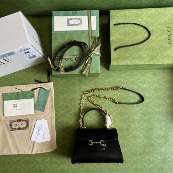 This is a Gucci Horsebit 1955 top handle bag in black leather with a structured silhouette. It features the iconic gold-tone horsebit detail on the front pocket, a single top handle, and a detachable gold chain strap for versatile carrying. Its elegant and timeless design makes it perfect for both formal and everyday occasions.