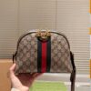 Crafted from GG Supreme canvas with a mosaic Web stripe pattern, the domed shoulder bag is reminiscent of classic designs. The Double G—an archival code—appears on the leather clasp and zipper pull.