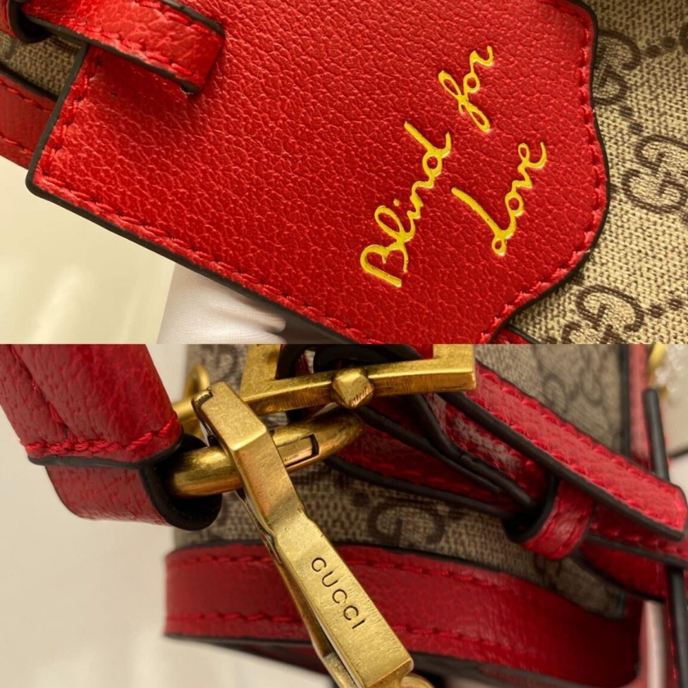 This Gucci bag is a true statement piece, blending GG Supreme canvas with striking red leather trim. The standout jeweled bee clasp with crystal embellishments adds a touch of whimsy and luxury.