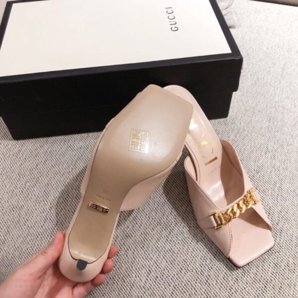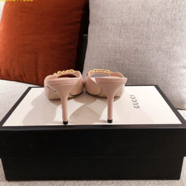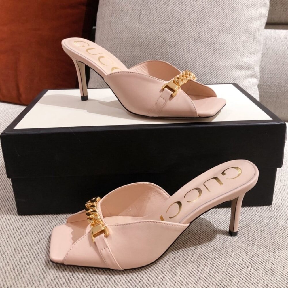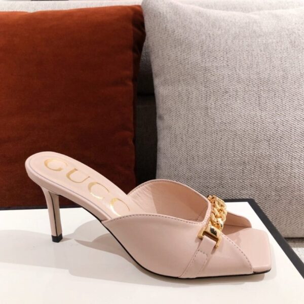 The Gucci Sylvie Chain Mule Sandals in pink embody timeless femininity with sleek lines and the Maison’s iconic chain detail. A refined union of elegance and comfort, they elevate every step with an aura of prestige and modern luxury.
