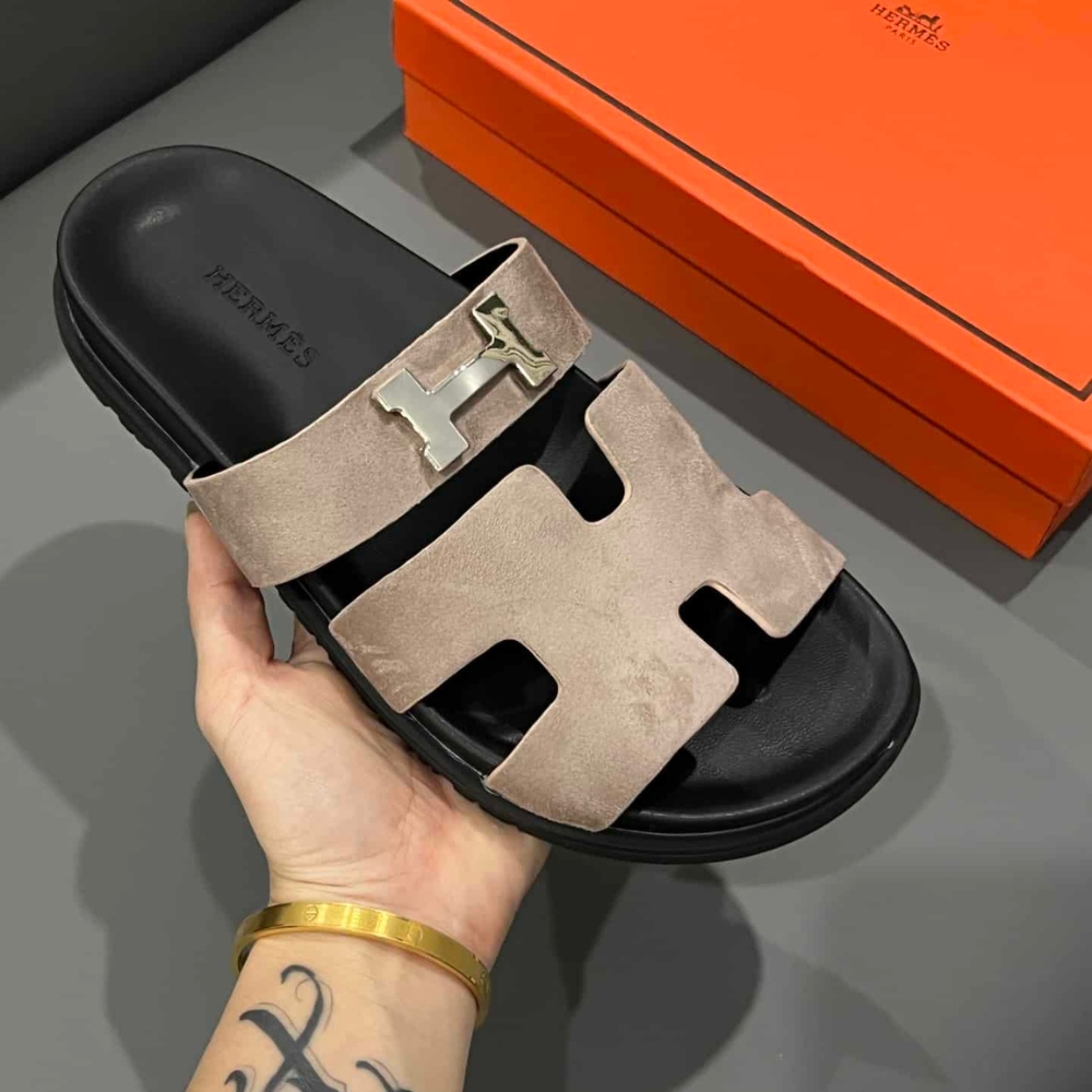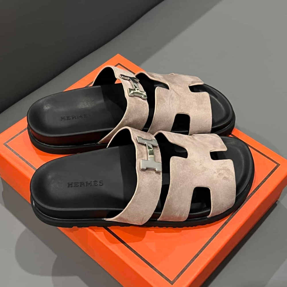 Hermes Chypre Sandal Suede H Logo Silver Hardware Light Brown