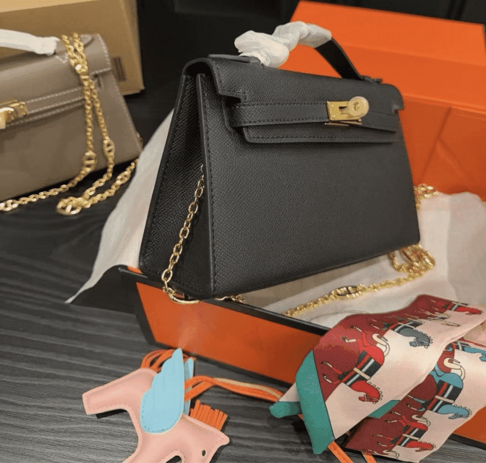 The Hermès Kelly Mini in black with gold accents embodies pure sophistication, with its sleek silhouette and timeless design lines radiating elegance. A symbol of prestige and refined luxury, it is the ultimate statement piece for those who command style with effortless grace.