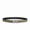 The Hermès Mini H Belt with a silver buckle and reversible grey strap redefines modern sophistication with timeless allure. Its sleek design and iconic emblem make it a versatile statement piece that exudes effortless prestige and refined elegance.