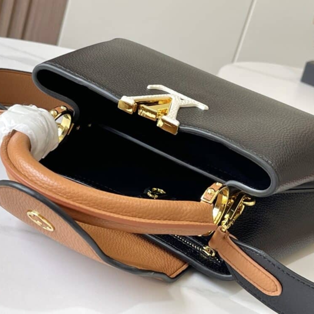 Introducing the tricolor Capucines MM, designed in a seasonal palette that encapsulates timeless sophistication. The classic double-carry style is adorned with gold-toned hardware and signature LV Initials. Both chic and functional, it has an organized interior, which includes a zipped pocket for valuable items. The adjustable strap is removable if desired.