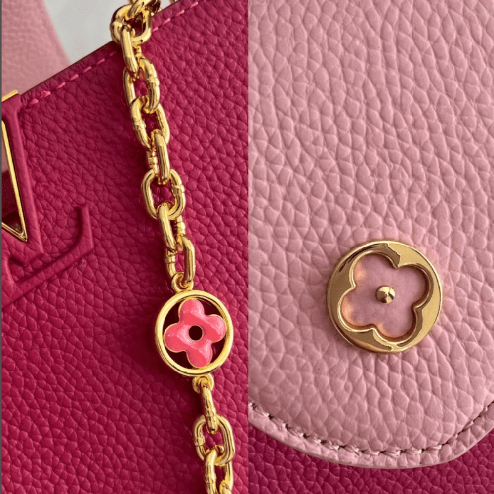 This very feminine Capucines Mini bag is made from leather with light pink on the flap and top handle. It features a gold-colour chain decorated with enamel Monogram Flowers for shoulder carry as well as a detachable, thin leather strap for cross-body and shoulder wear.