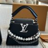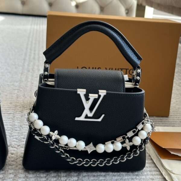 Part of the Trilogy line, this Capucines Mini is the epitome of sophistication with its triple chain adornment, one of which is strung with delicate mother-of-pearl effect. Opens to reveal a compartmented interior with a flat pocket for cards. The perfect evening style, it can be worn cross-body or carried by hand.
