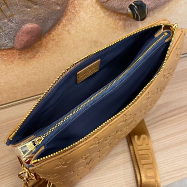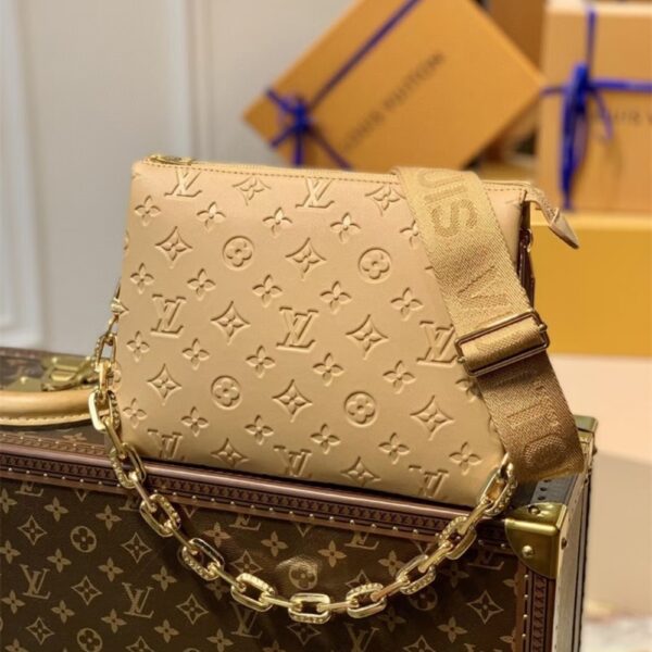 Fashioned from accessorized with a chunky gold-color chain, this Coussin PM handbag is part of the Prefall 2021 collection. Its bright, vibrant colorway is Nicolas Ghesquière’s translation of a bold, joyful feminine attitude. The Coussin can be worn cross-body with the strap, on the shoulder by its short chain, or tucked under the arm.