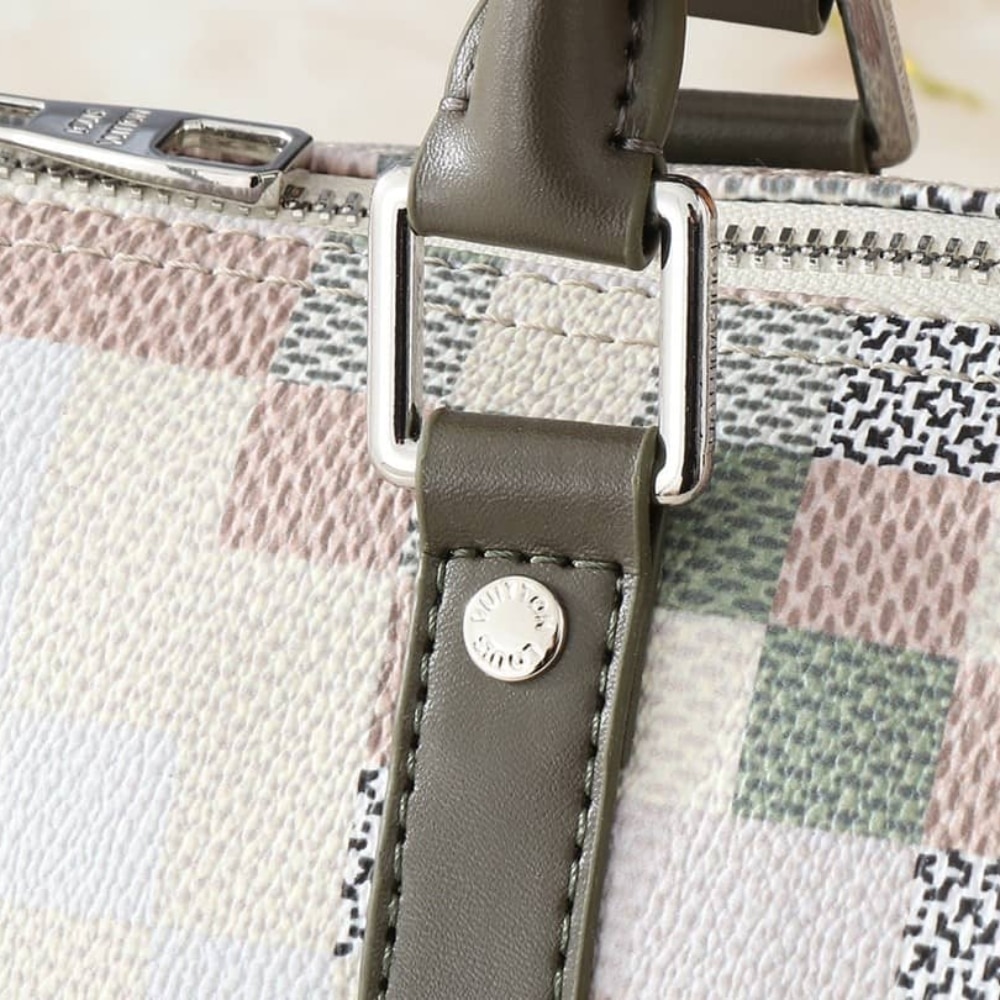This Keepall Bandoulière 25 city bag is fashioned from beige Damoflage canvas, with its pixelated treatment of the Damier checkerboard. Trimmed with khaki-color leather trim, it features an exquisitely crafted LV charm. Versatile, the bag has two rolled leather top handles for hand carry and a removable and adjustable strap for shoulder or cross-body wear.