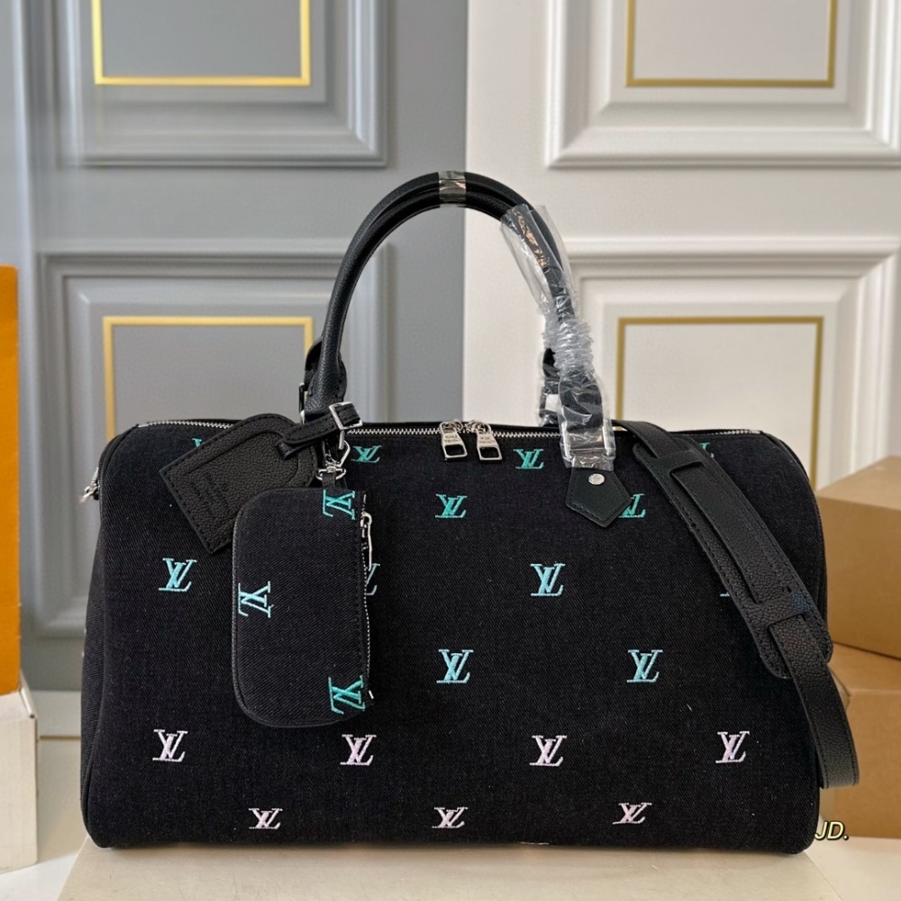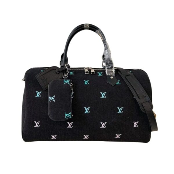 Crafted from the unique LV Blason Denim, the Speedy Bandoulière 40 is a fusion of musical inspiration and the fashion language of Creative Director Pharrell Williams. On the black Denim fabric are intricately embroidered LV logos with a gradient effect, combined with headphone accessories and a leather name tag, both of which are easily removable.