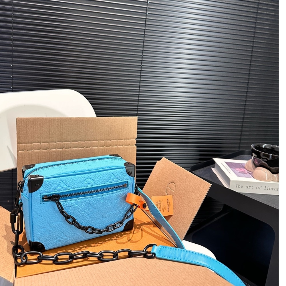 A vibrant turquoise colorway and black-color hardware gives this Mini Soft Trunk bag a fashionable feel. The reinforced corners, chain detail on the front, and adjustable chain strap, all in graphic matte-black, anchor the bag in Louis Vuitton’s heritage.