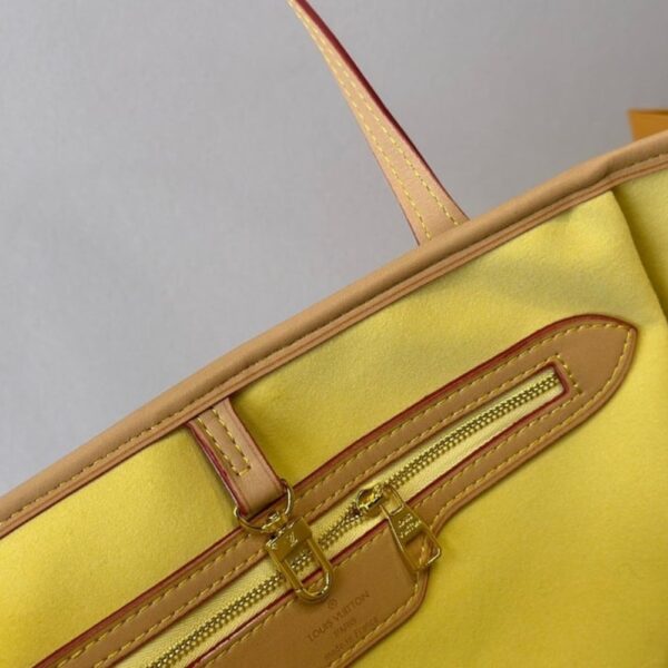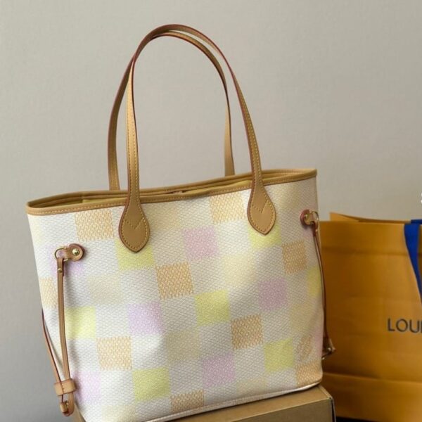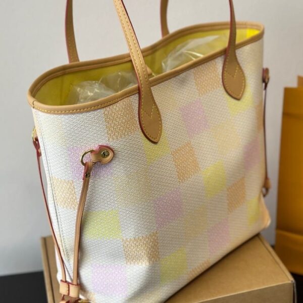 This roomy Neverfull MM tote is made from Damier Giant canvas, playfully updated in a colorway combining four different pastel tones. This functional carryall can be cinched closed with its side laces or left open for a more casual look. Inside, there’s a removable zipped pouch in matching canvas that can be used separately.