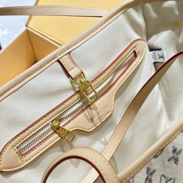 This spacious Neverfull MM is part of the Nautical capsule and features multicolored LVs and Monogram Blossoms. Sixty-six multicolored threads, in a subtle gradient of colors, are woven together to create the jacquard motif. Connected to the long shoulder straps is an engraved mirror charm. Inside, there’s a matching removable zipped pocket.