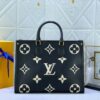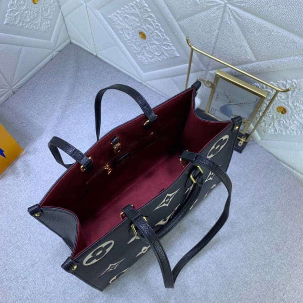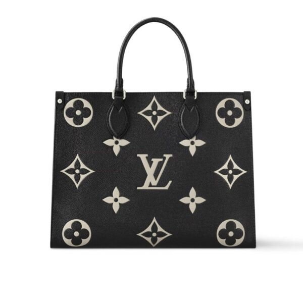 Made from Monogram Empreinte grained leather in a warm two-colour combination, this OnTheGo MM tote bag features the Monogram pattern embossed and printed onto the leather. Its boxy shape means it is roomy and can easily fit a laptop. It has two leather top handles for hand carry as well as two long shoulder straps.