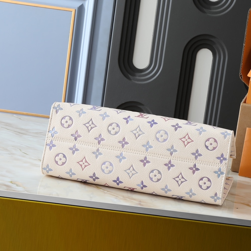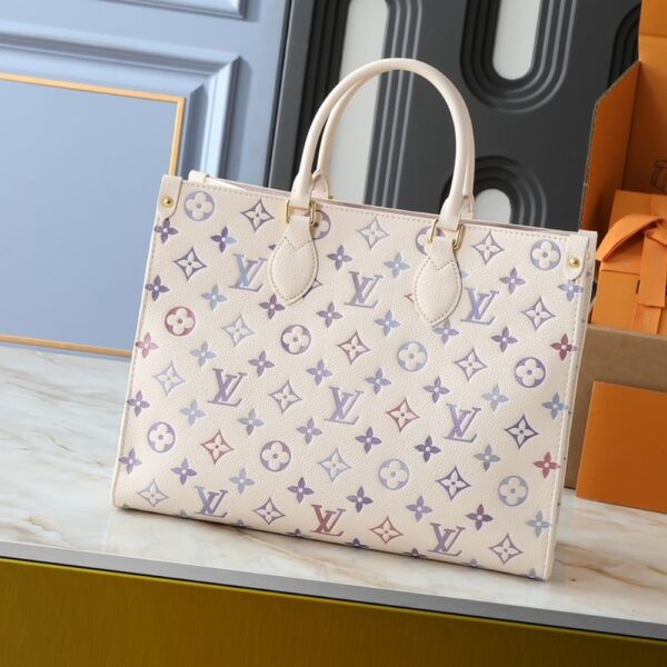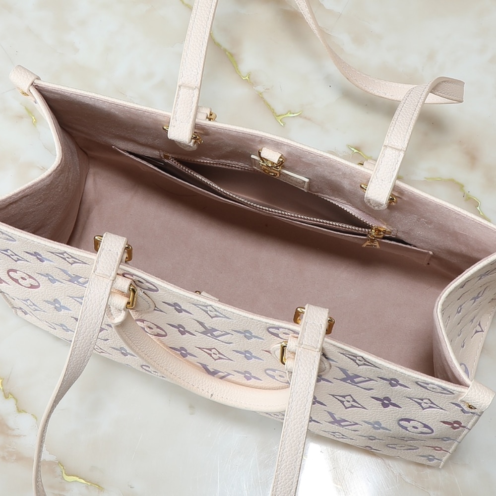Reimagined for the House’s Dream animation, this OnTheGo MM tote is an elegant everyday companion. It is crafted from Monogram Empreinte leather decorated with a unique digital printing technique to create a watercolor gradient. The style is finished with light gold-toned hardware and includes multiple pockets to store everyday essentials. Attach the longer strap to wear it cross-body.