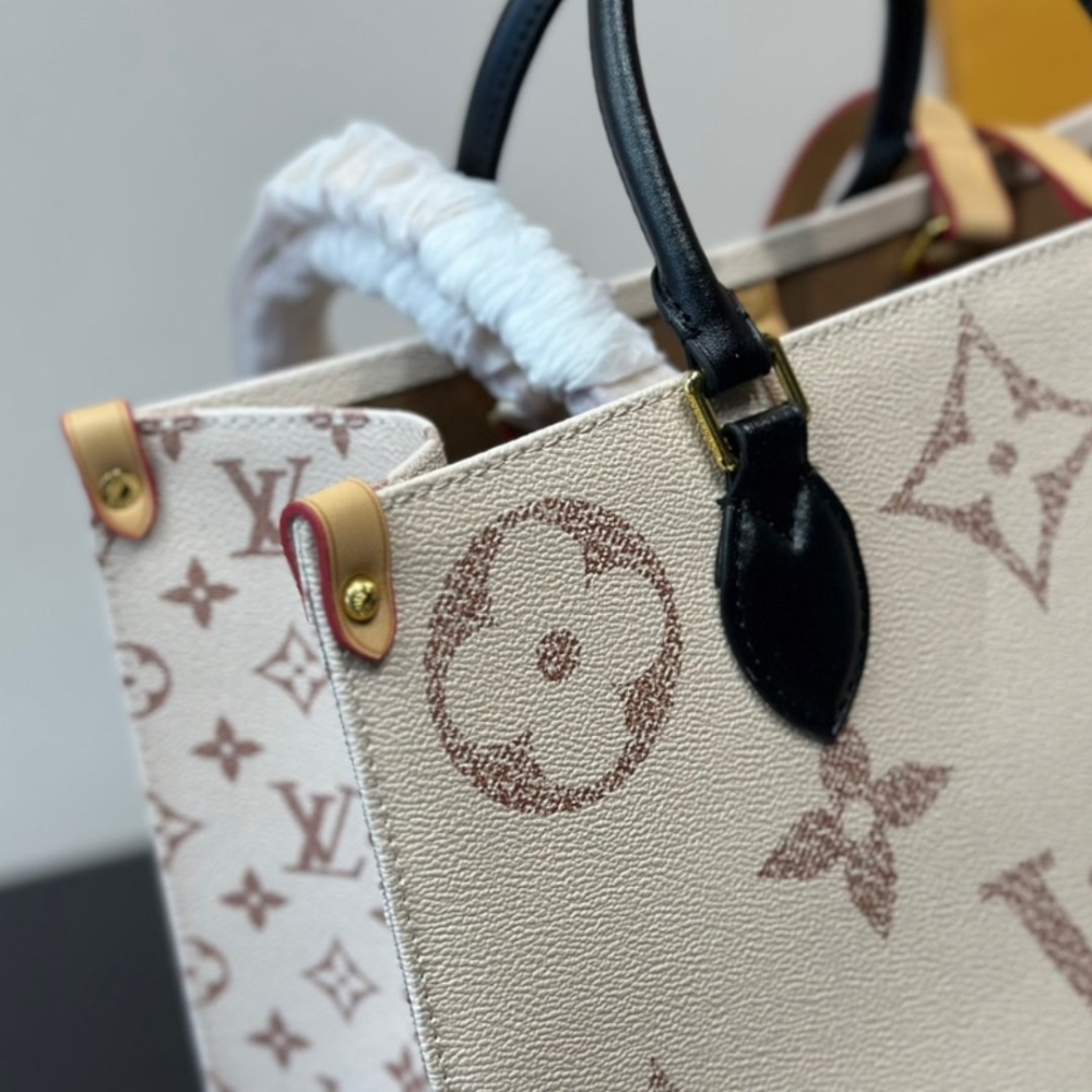 Louis Vuitton OnTheGo MM Tote Bag, specifically the Monogram Dune version from the Cruise 2024 collection. It features oversized Louis Vuitton monogram embossed on white leather with beige diamond stitching, inspired by sand colors. The bag includes black rolled leather top handles, long vachetta strap handles, and gold-tone hardware.