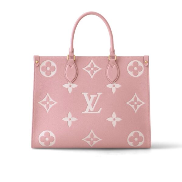 This OnTheGo MM tote bag is made from Monogram Enpreinte leather, with the Monogram Flowers and LVs in a cream color, embossed then printed on a pink background. Lined in a matching greige, this carryall is perfect for work or weekend. The OnTheGo offers both articulated top handles and long shoulder straps.