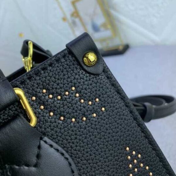 The OnTheGo PM handbag tote is made from grained leather with a Giant Monogram pattern composed of gold-coated studs. The rest of the hardware is gold-colored, including the rivets on the four corner tabs. In addition to the two top handles, there’s a detachable and adjustable strap for shoulder and cross-body carry.