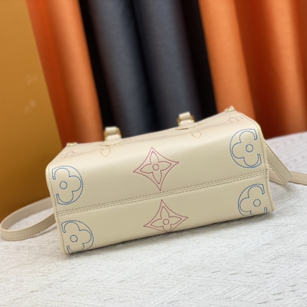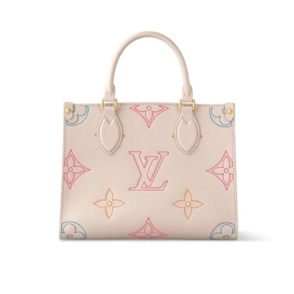 This On the Go Small handbag was introduced in the Fall 2023 LV Academy collection. Crafted from Monogram Empreinte embossed leather with an embroidered Monogram pattern, its playful texture and color make it the perfect bag for school season.