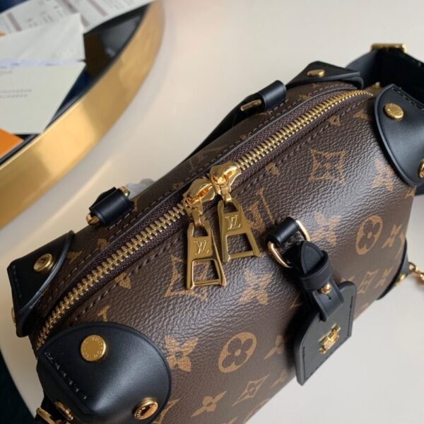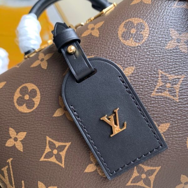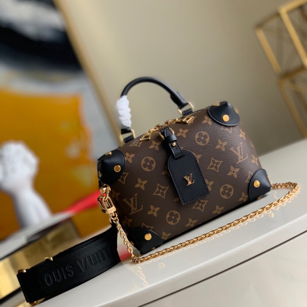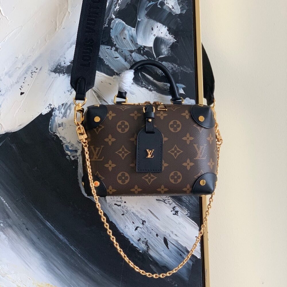 This is the Louis Vuitton Cannes Bag in Monogram canvas, a chic mini silhouette inspired by classic vanity cases. It features structured lines with black leather trim, gold-tone hardware, and the iconic LV luggage tag. With a top handle, chain detail, and wide strap, it offers both elegance and versatility for day-to-night styling.