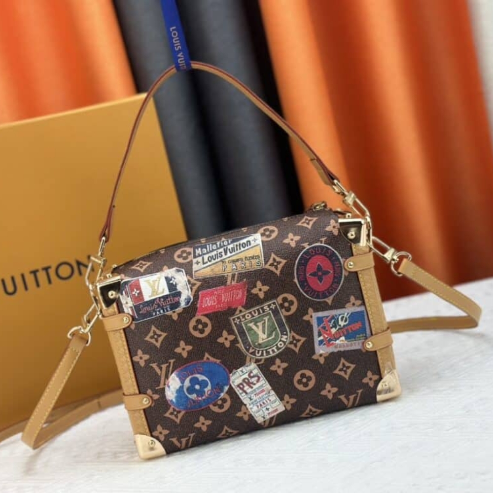 From the Spring-Summer 2024 show comes this Side Trunk MM handbag. It is inspired by the Maison’s archive-trunk Monogram canvas, made of a blend of cotton and linen glazed with resin for a superbly soft hand. Decorated with hotel labels that pay tribute to Gaston-Louis Vuitton’s fabulous collection. Both handle and strap are removable.