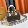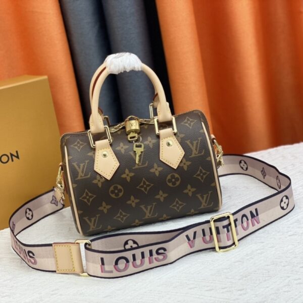 The Speedy Bandoulière 20 hand bag takes on classic Louis Vuitton allure in Monogram canvas with leather trim and gold-color hardware. Inspired by the House’s emblematic travel bag, its distinctive shape is adorned with two rolled-leather top handles, padlock. A detachable two-color strap, signed Louis Vuitton, enables shoulder and cross-body wear.