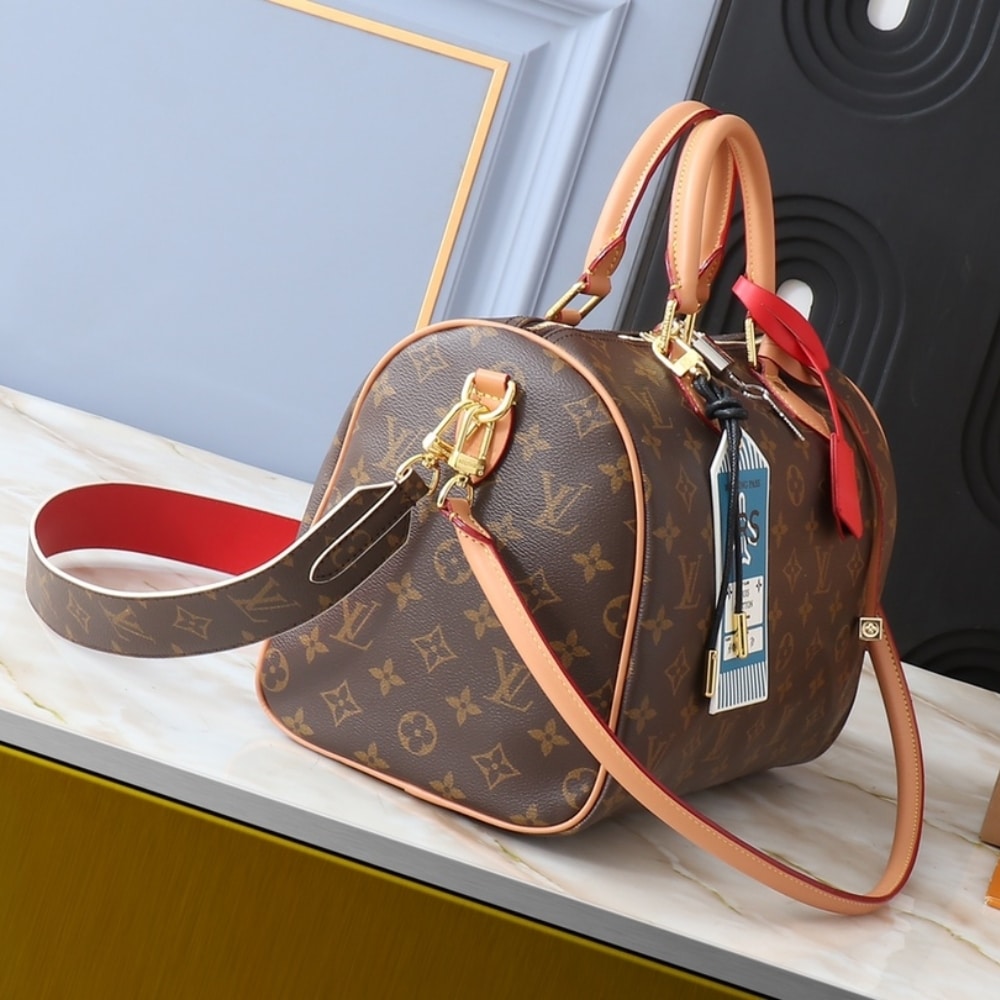The Speedy Soft 30 Crafty is crafted from soft Monogram Canvas with a striking red leather lining and a matching bell key tag. It also features a fun trunk and boarding pass detail, along with an interior zippered pocket for your passport and important items. A new Toron strap completes the chic travel look.