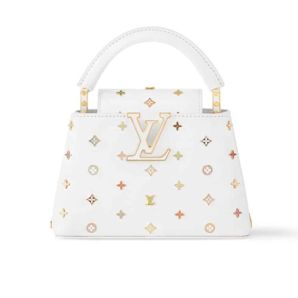 The joyful rainbow palette of Japanese artist Takashi Murakami uplifts this chic Capucines Mini with a fresh signature finish. It is crafted in playful proportions, which is embellished with a multicolored Monogram motif in metallic studs, while the soft pink cowhide lining strikes a subtle contrast inside. A removable braided strap offers versatile carry options, and the compartmented interior organizes daily essentials such as a smartphone and a compact wallet.