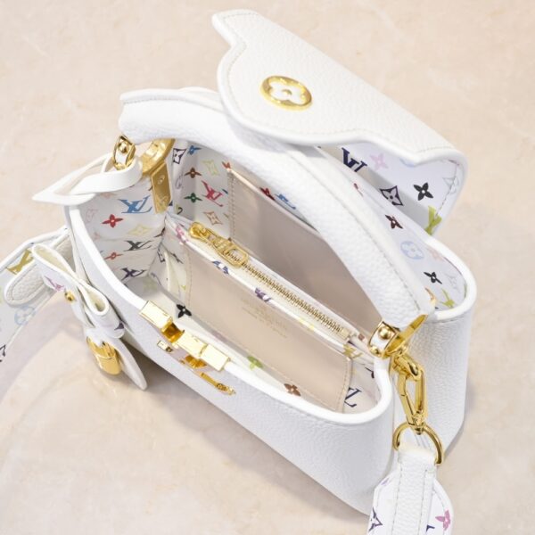 Joyful detailing from the re-edition of the Louis Vuitton x Murakami uplifts the House’s iconic Capucines handbag with a playful spirit. The emblematic LV Initials and removable Monogram strap are accented with vibrant tones inspired by the artist’s signature rainbow palette, while a chic bow-shaped keybell with a padlock attachment completes the look. The compartmented interior is large enough for daily essentials and organized with multiple pockets.