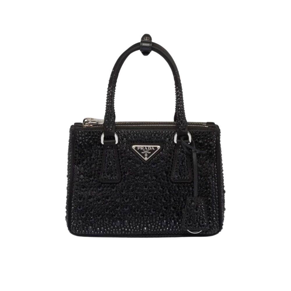 The Prada Galleria Satin Mini Bag with Crystals in black radiates pure glamour, transforming an icon of timeless design into a dazzling statement piece. Its refined silhouette, adorned with sparkling brilliance, embodies modern luxury that elevates every look with irresistible prestige.