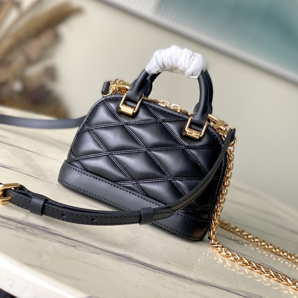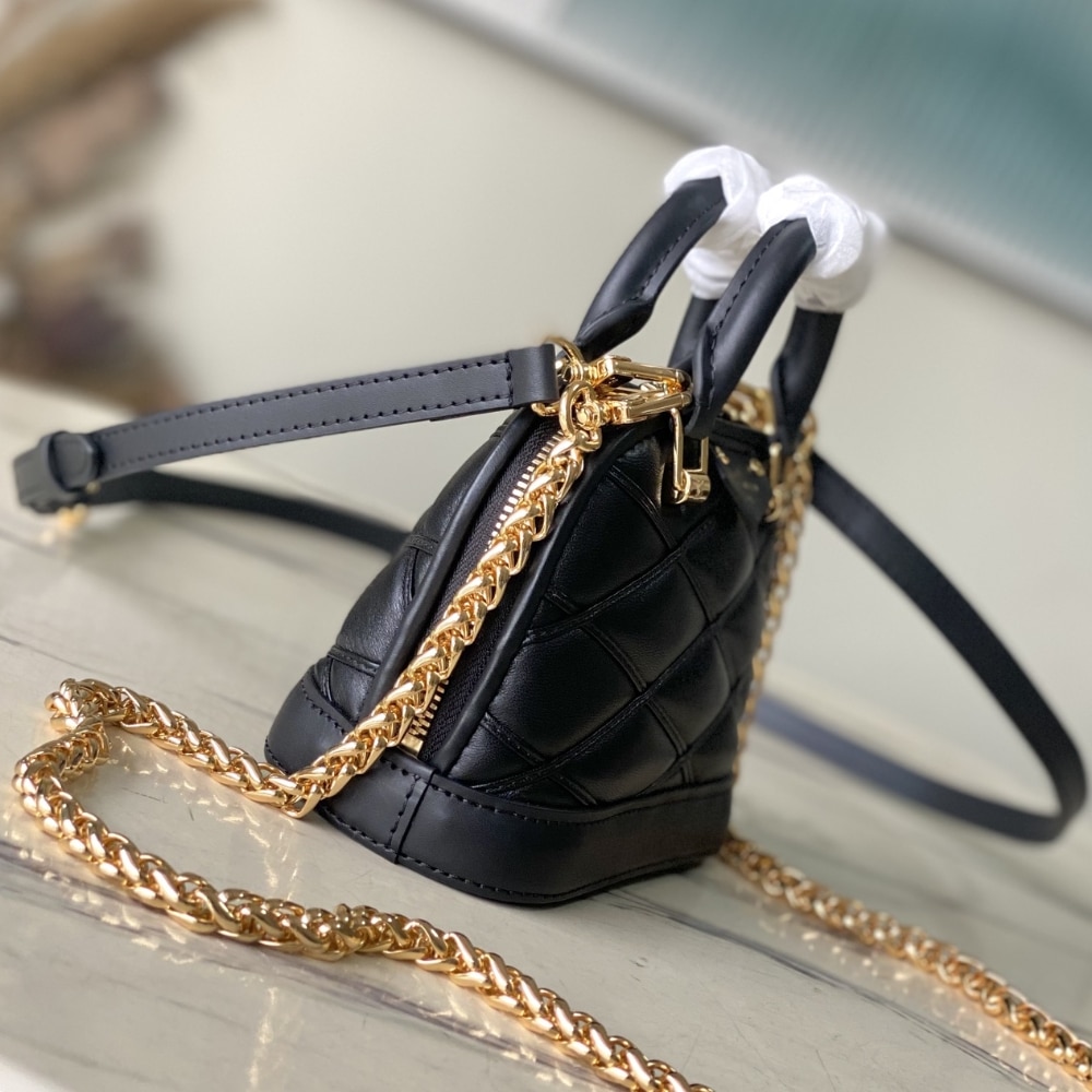The Nano Alma is a miniature replica of Louis Vuitton’s iconic Alma bag. This edition is crafted from luxurious leather with a quilted Malletage pattern that references the crisscross lining of the House’s historic trunks. This design conveys refinement, offering different looks and carry options thanks to its two handles, gold-tone chain and removable, adjustable leather shoulder strap.