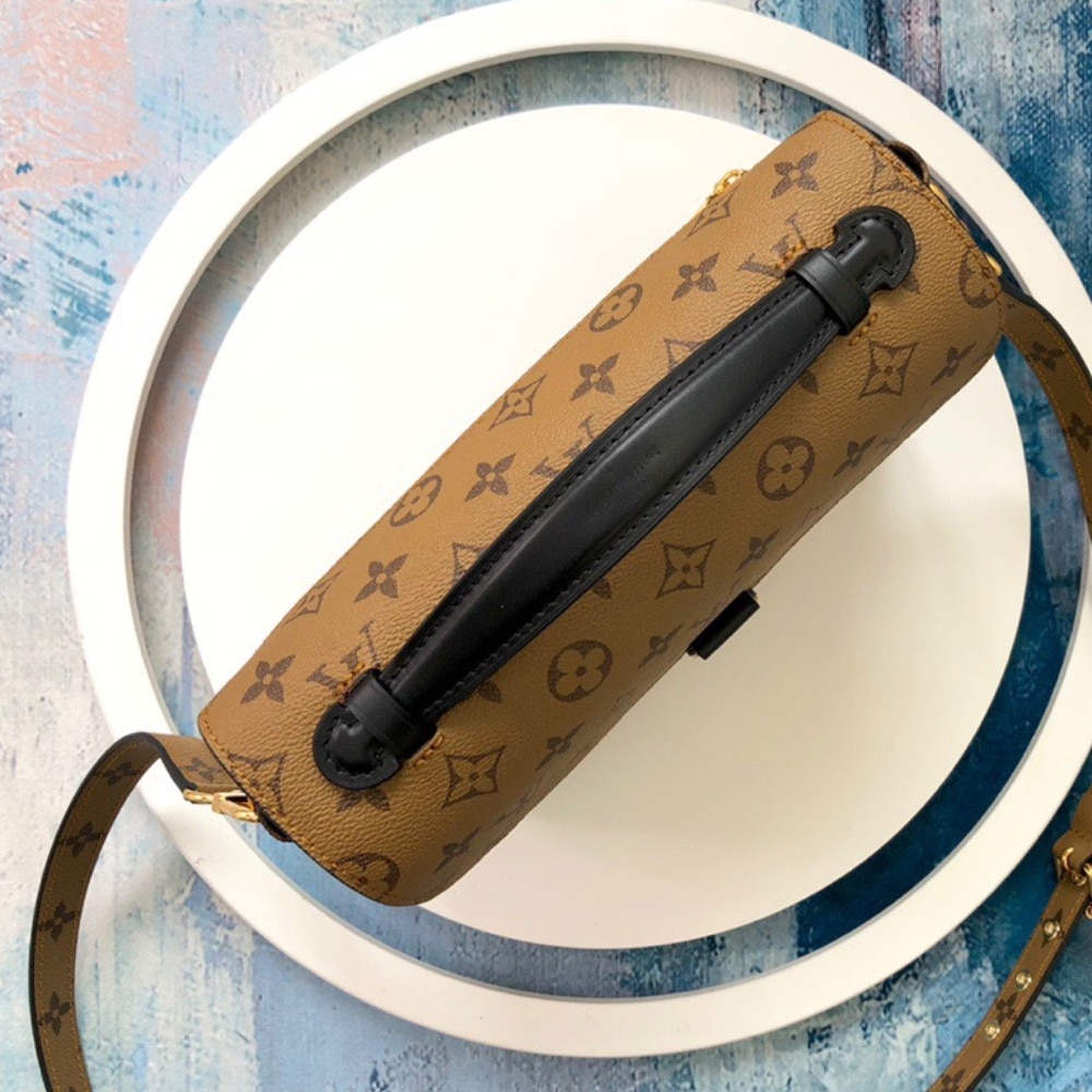 Featuring a signature Satchel shape, the Pochette Métis bag makes its mark with its compact design and Monogram Reverse Canvas material. The design is spacious, accented with shiny gold-colored metal details such as the iconic S-lock. The handle and long, detachable strap allow it to be worn over the shoulder or crossbody.