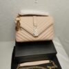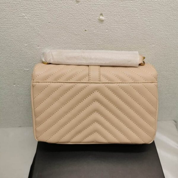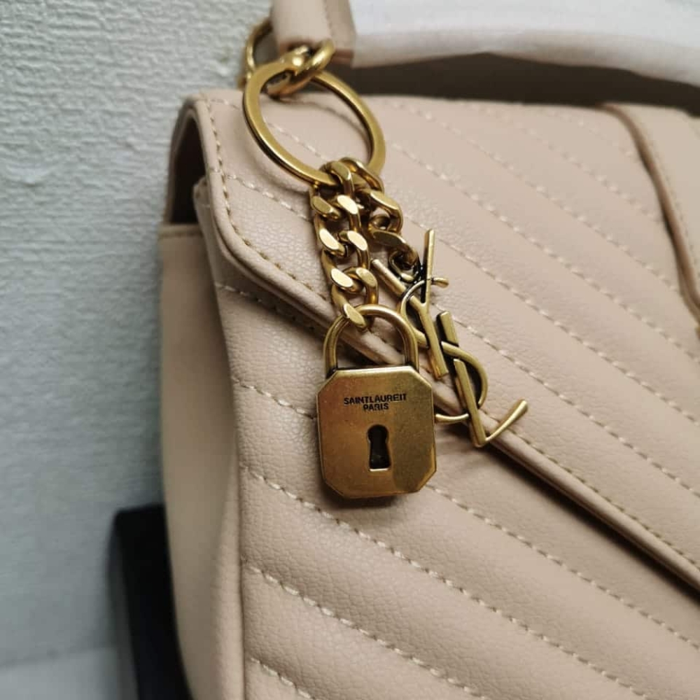 The Saint Laurent College Large Chain Bag Beige 25cm is a timeless piece crafted in quilted leather with the iconic YSL monogram. Featuring a top handle and a removable chain strap, it offers versatile styling as a shoulder or crossbody bag. Its structured silhouette and elegant beige tone make it a refined choice for both day and evening looks.