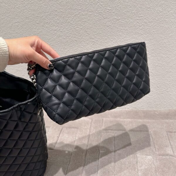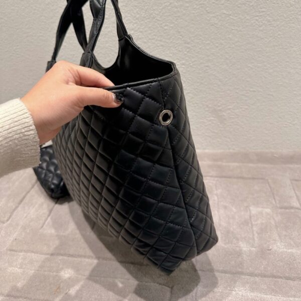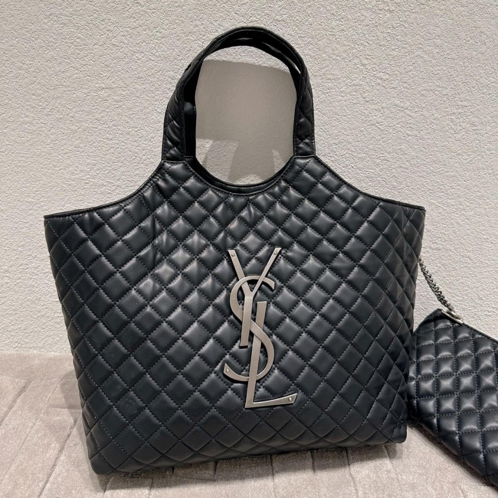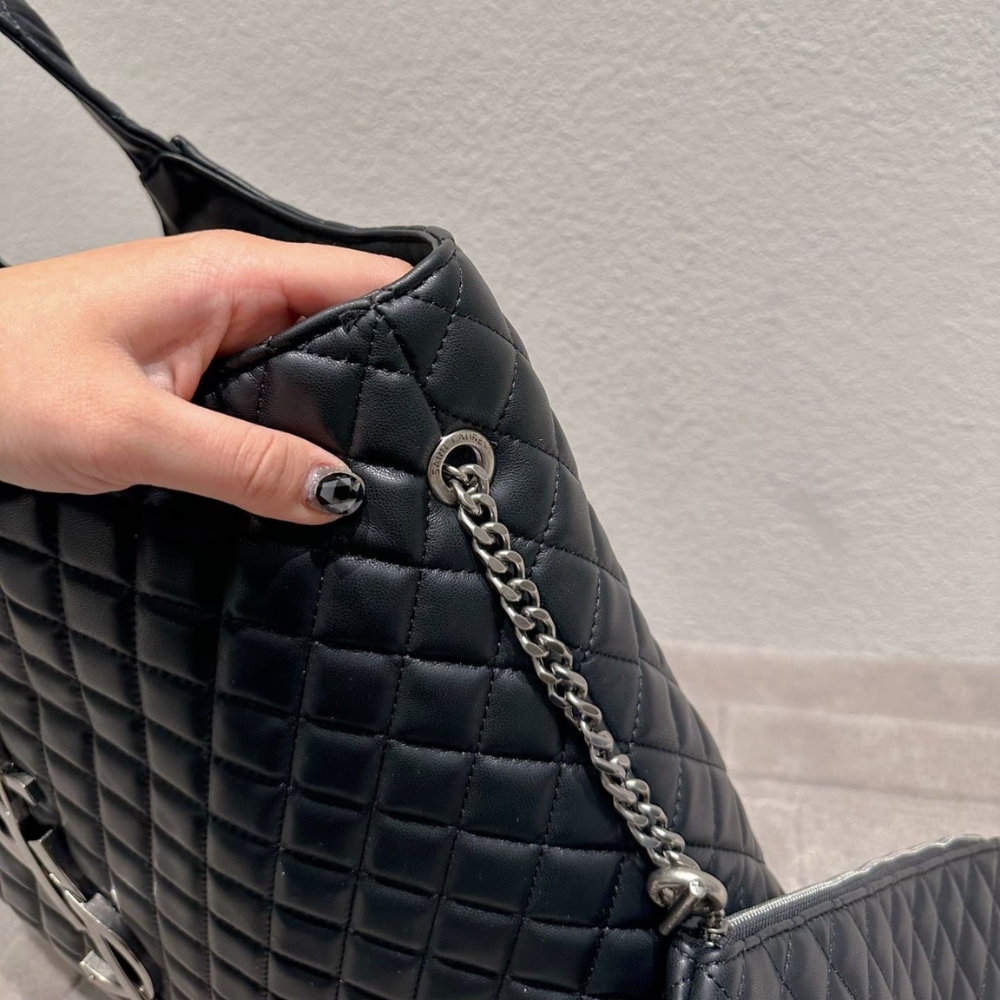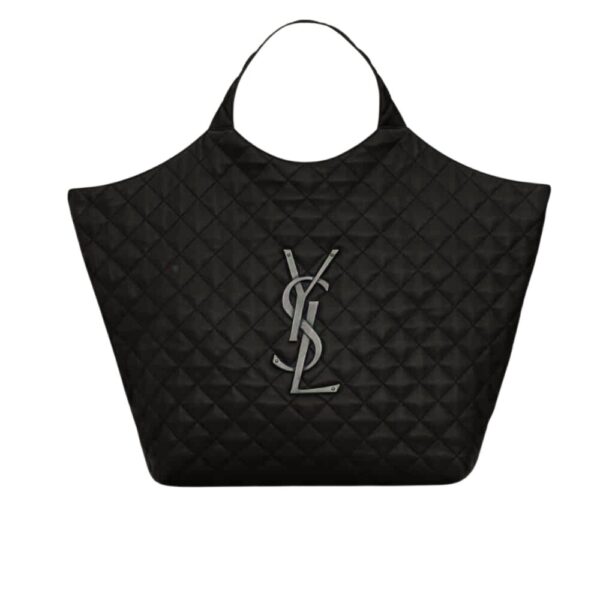 Saint Laurent Icare Shopping Bag In Quilted Black – featuring a diamond-quilted design with oversized YSL silver-tone hardware. The spacious silhouette combines elegance with practicality, perfect for everyday or travel. Comes with a matching pouch for added convenience