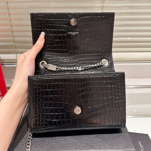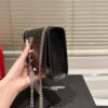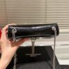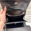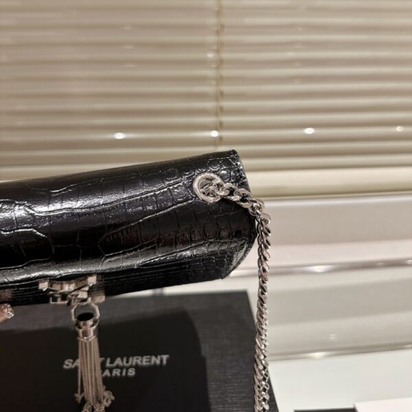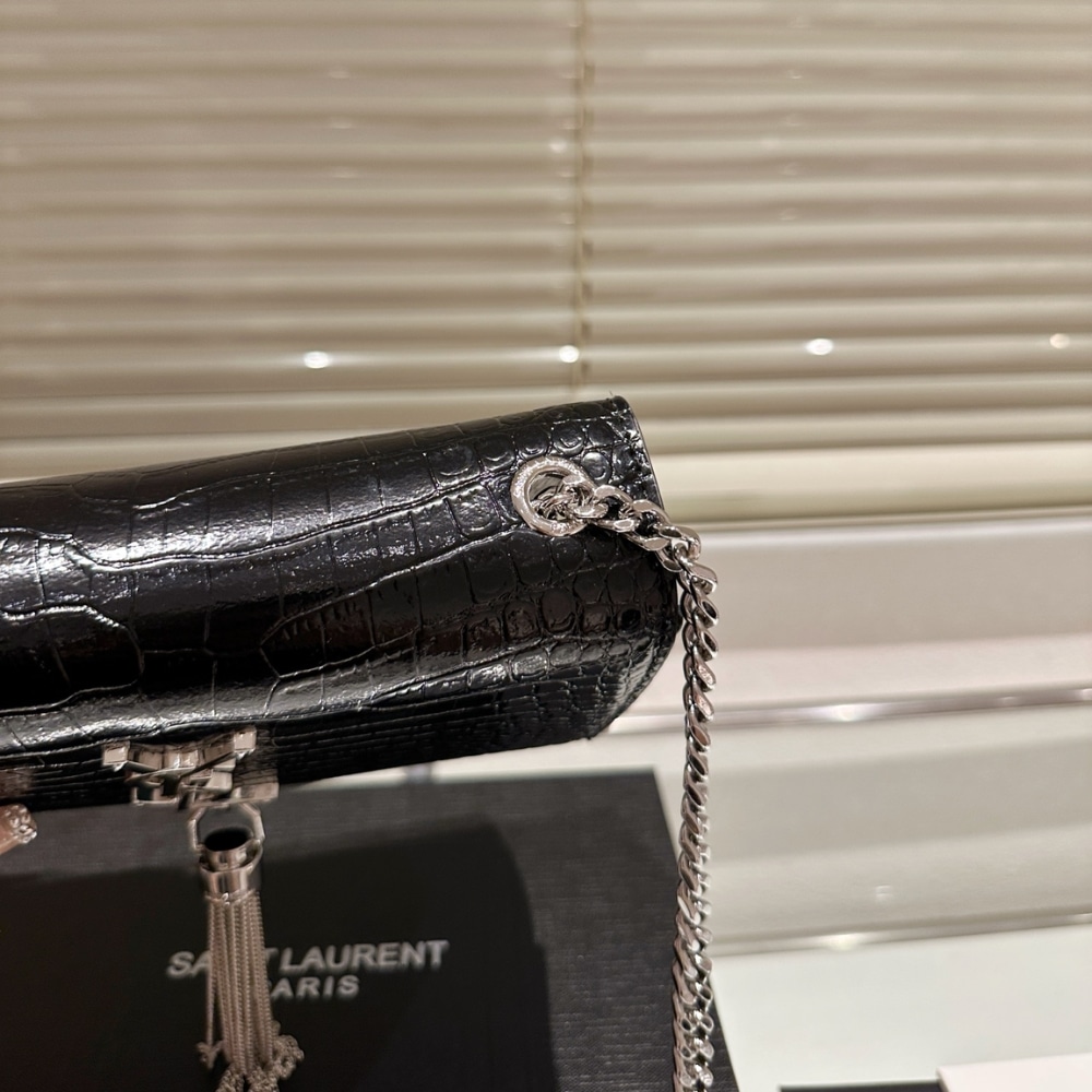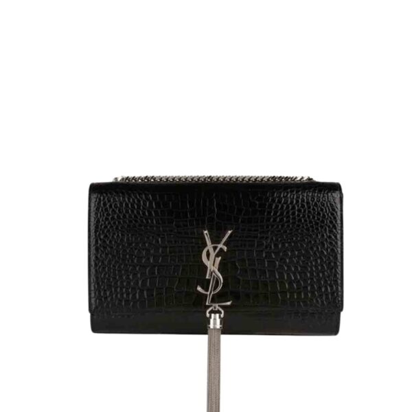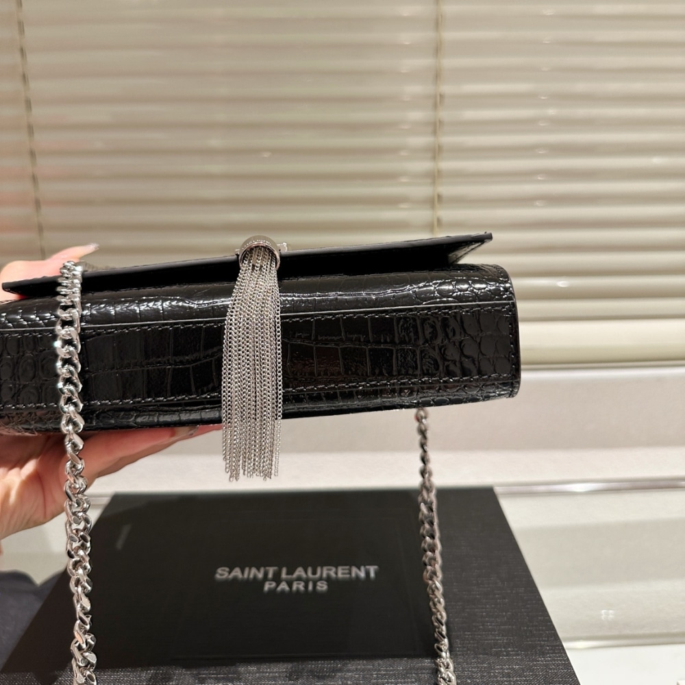 A striking evening bag featuring croc-embossed black patent, the iconic YSL monogram in silver, and an elegant tassel detail. Its compact shape and chain strap make it a timeless statement piece.