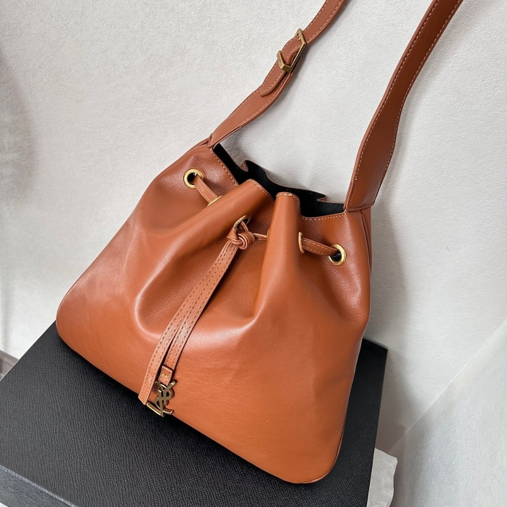 Saint Laurent hobo Bag in smooth brown, detailed with a subtle gold YSL logo. Its drawstring closure and relaxed silhouette balance practicality with Parisian chic. A versatile shoulder bag that effortlessly elevates casual and refined looks.
