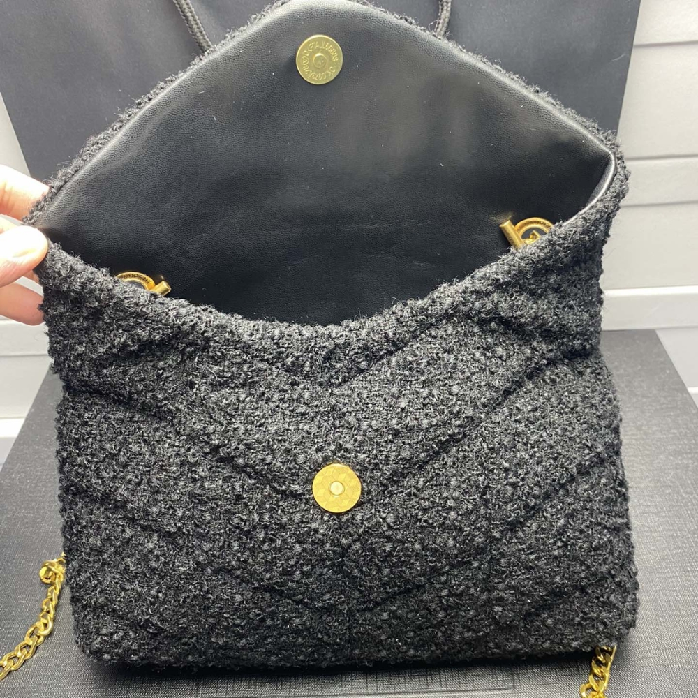 The Saint Laurent Bag in luxe black, accented with a bold gold YSL logo. Its soft, slouchy silhouette adds effortless Parisian chic to any outfit. Finished with a gleaming gold chain strap, it’s the perfect mix of elegance and edge.